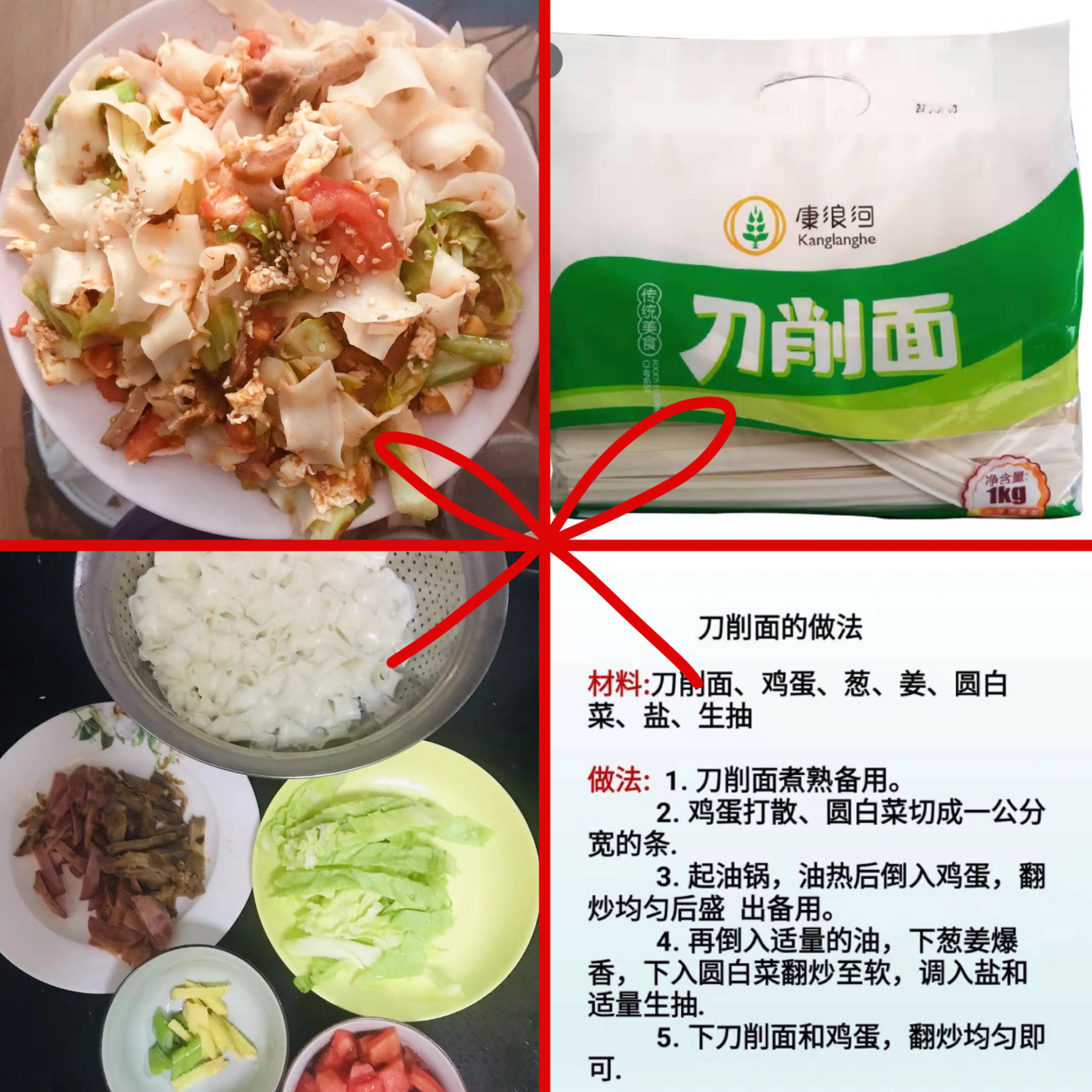 刀削面、雞蛋、蔥、姜、圓白菜、鹽、生抽